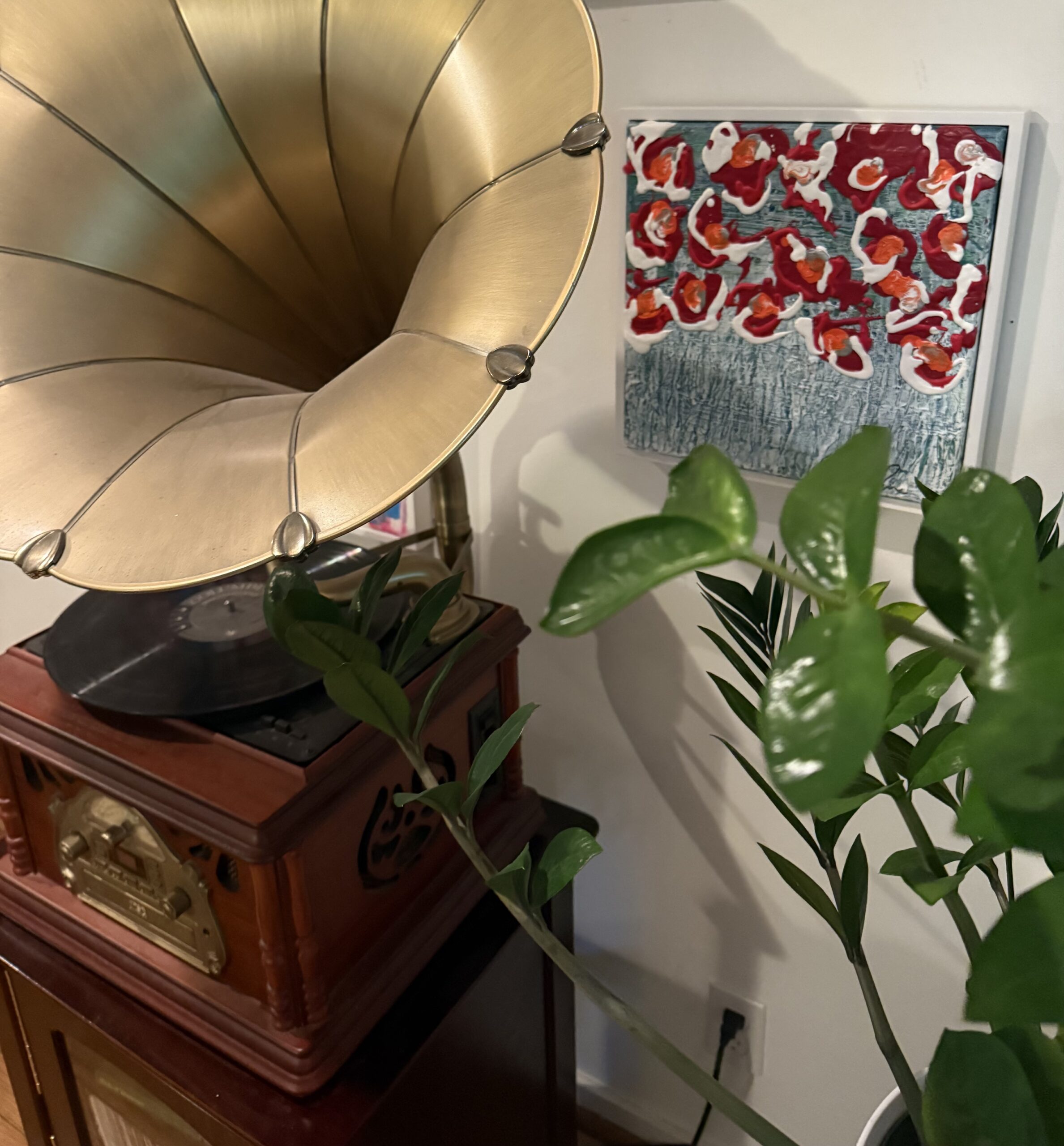 About the piece: My friend Lisa introduced me to the joy of growing flowers a number of years ago. I had never really been into growing flowers, but all the sudden I’ve found it therapeutic and wonderful. Now I take to the garden both in paint and in planting. When I was a child I always really liked Red Poppies and they are reflected in this piece.